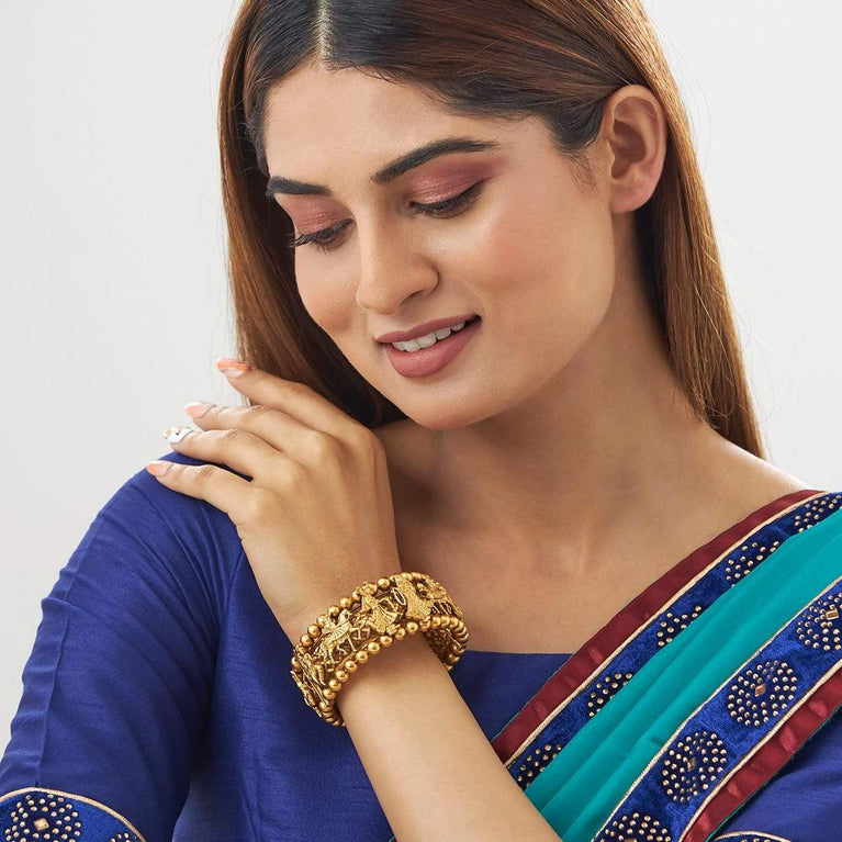 Traditional Design Antique BangleEmbrace the main character's energy with these antique bangles. Set in a rich gold tone polish, these bangles are the epitome of simplicity and festiveness in harmony. Pair with an anarkali for a Bollywood movie kind of look, or pair with evergreen sarees for a traditional look.