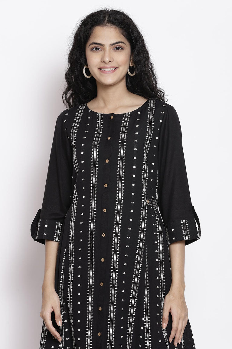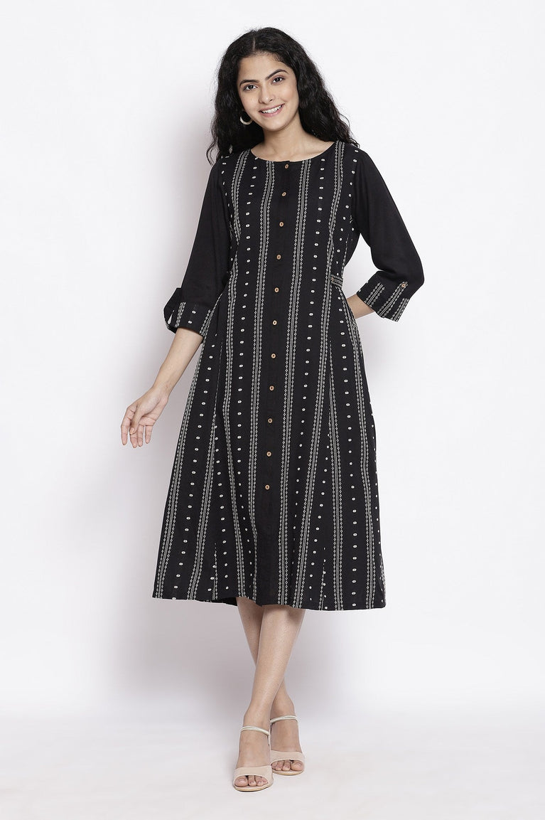 Jet black gathered rayin cotton dress in boat neck and three-quarter sleeves.