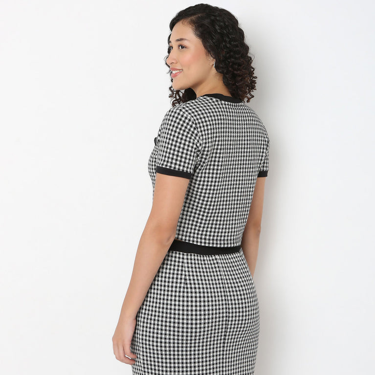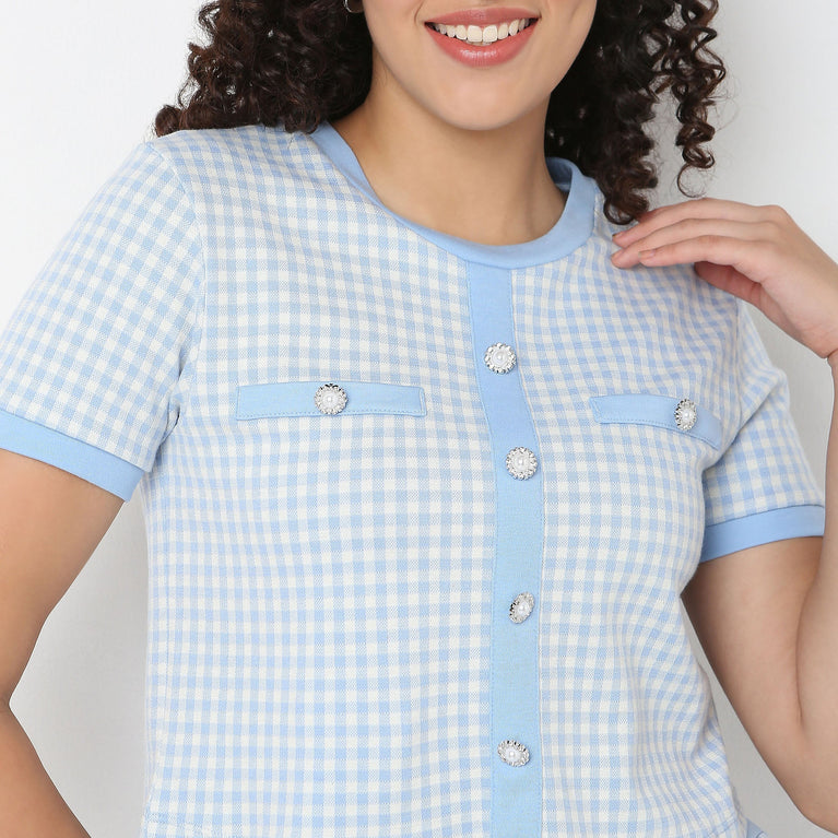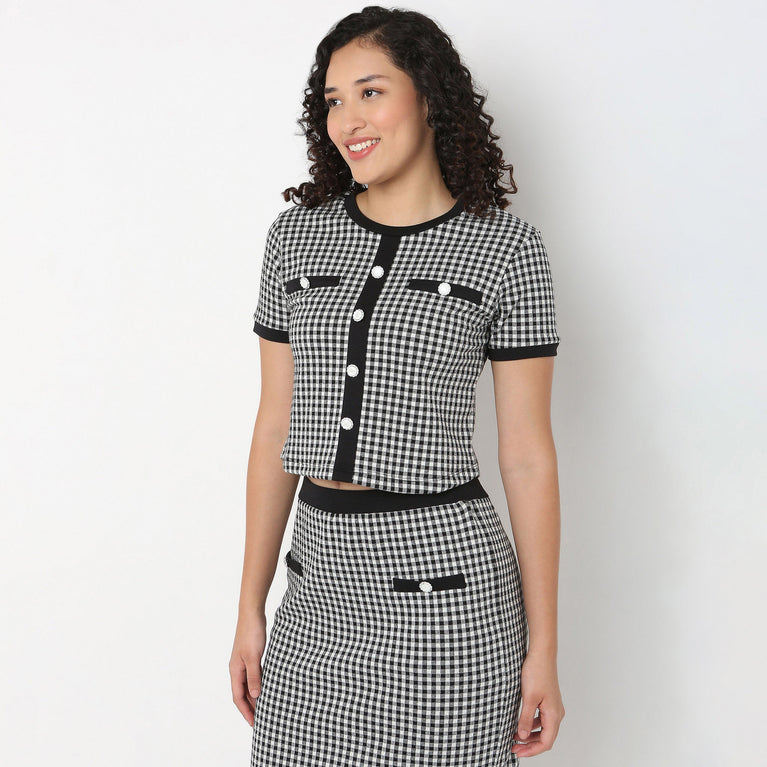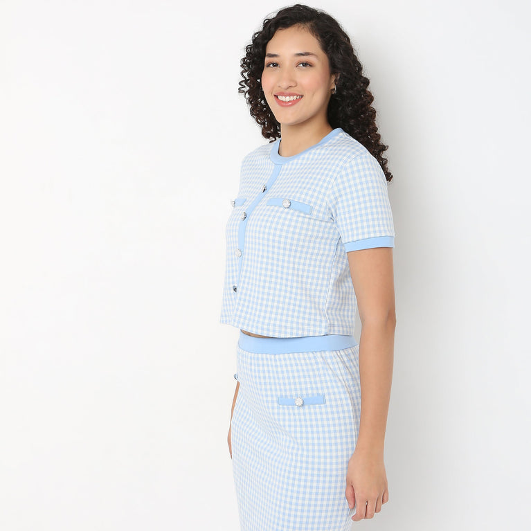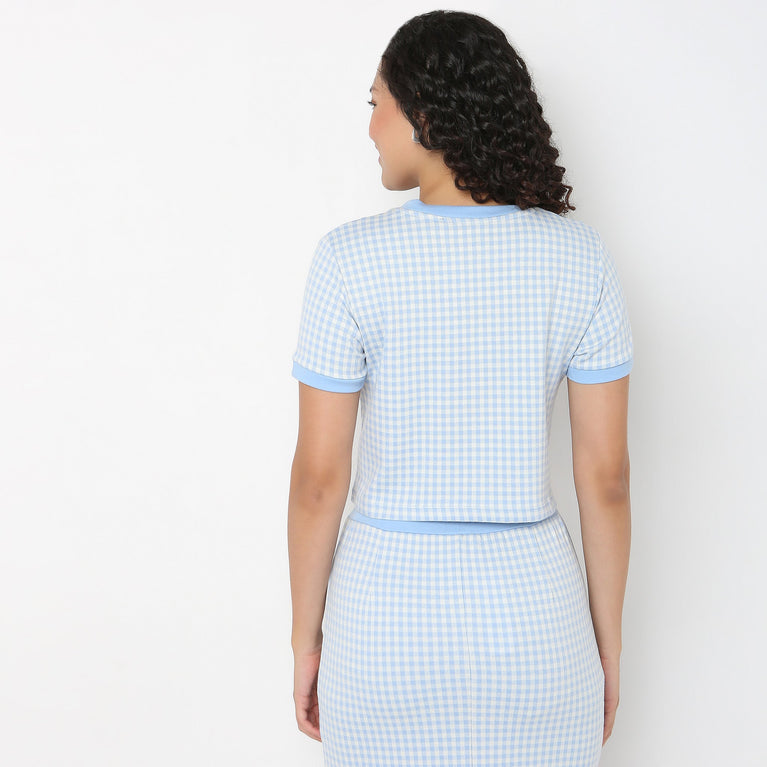 Checkered Lapel Collar Full Sleeve Crop T-Shirt