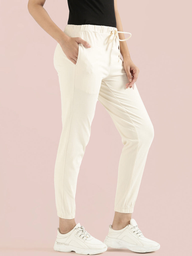 From running errands to casual chilling with friends, Solid Cream Joggers are your perfect pair of bottomwear. Made from cotton, polyester & elastane, it has elasticised waistband with drawstring closure, slant