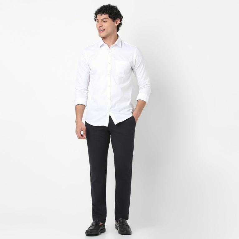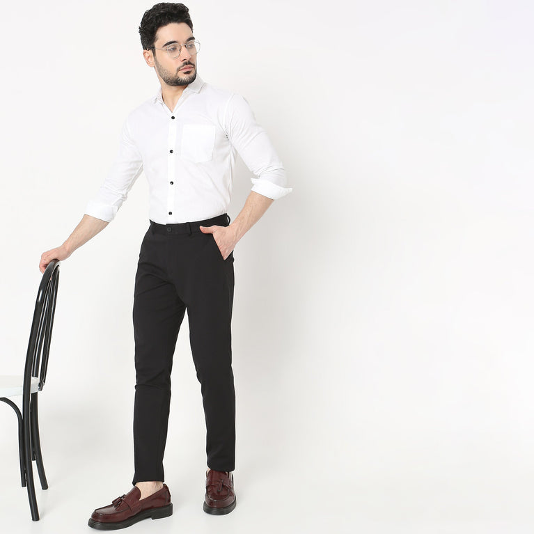 These modern nerd theme, solid pattern regular fit chinos has ankle length, mid rise waist. Made from polyester viscose spandex, it is soft and comfortable to wear.