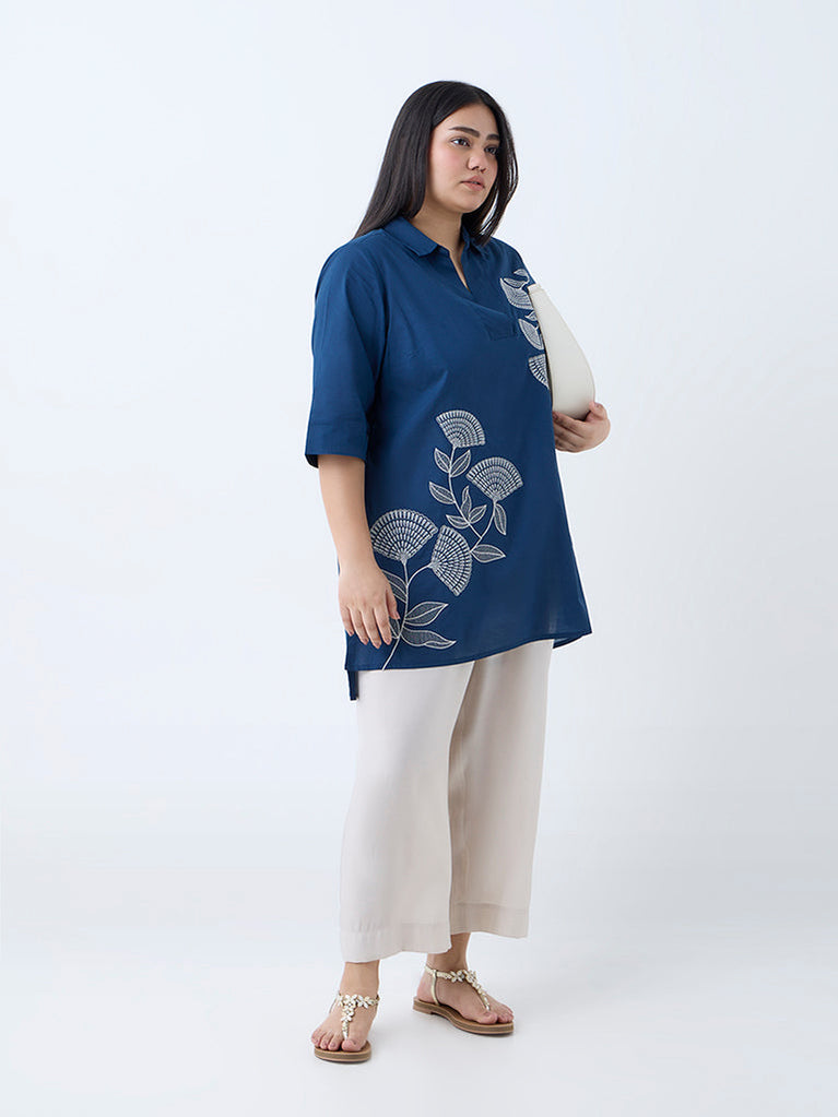 This navy tunic from Diza is brought to life with vivid floral embroidery that draws the eye to the front panel. Cut from pure cotton, it’s designed for breathability and all-day ease. The collared neck and three-quarter sleeves offer a balanced frame, while the high-low hem adds a graceful touch of drama to the relaxed silhouette.