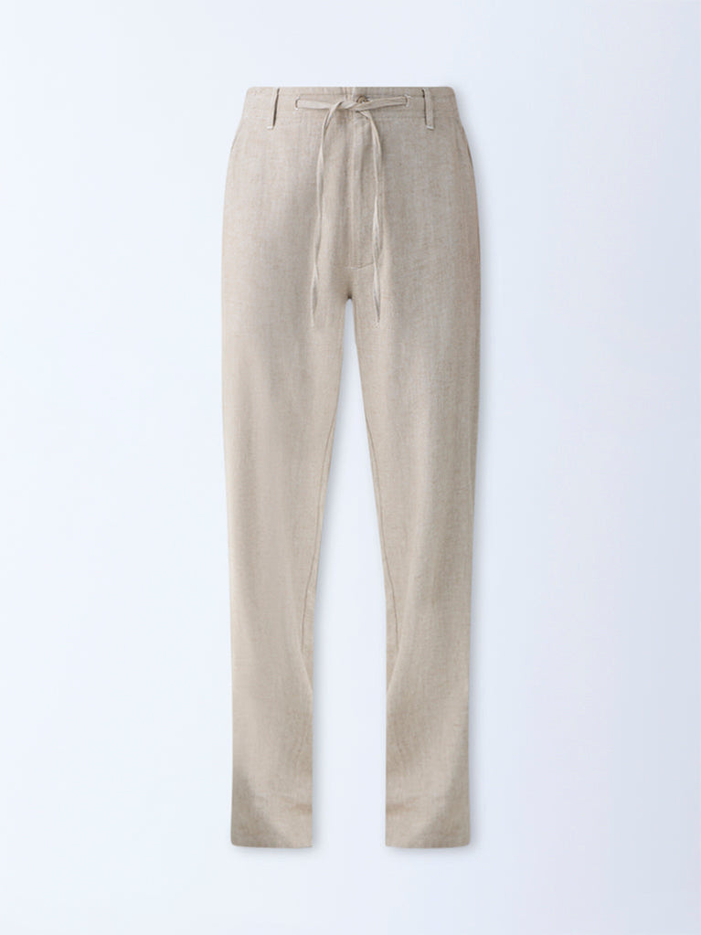 Bring sophisticated charm to your daytime assortment with these beige chinos from ETA. Cut in a relaxed fit, they feature a buttoned waistband with adjustable drawstrings, a zipper fly, and belt loops for a comfortable finish. Multiple pockets enhance functionality, while the soft cotton-blend fabric ensures all-day ease.