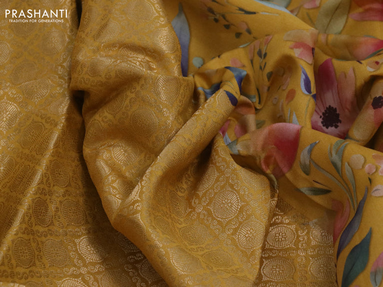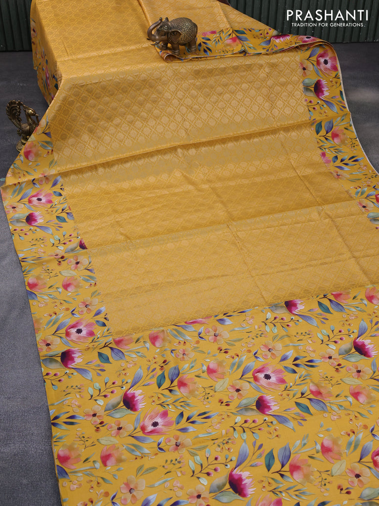 Banarasi silk saree mustard yellow with allover zari woven brocade weaves and floral digital printed border
