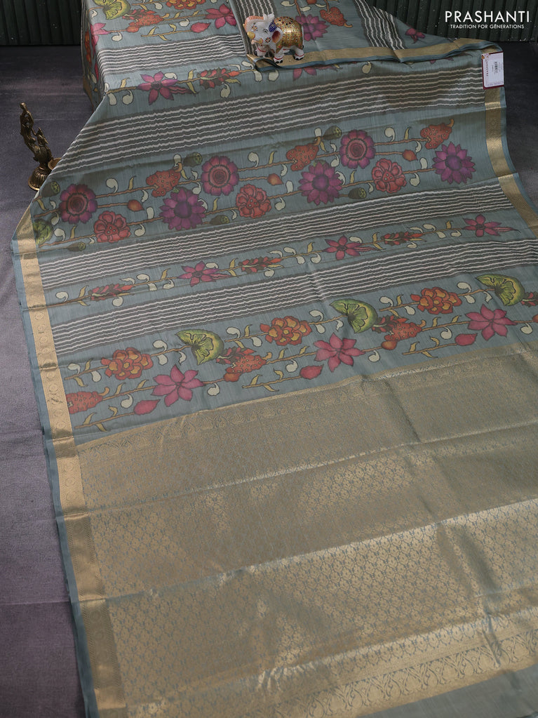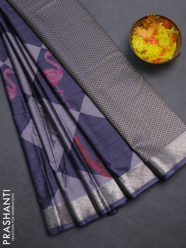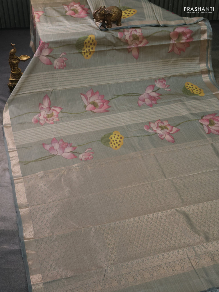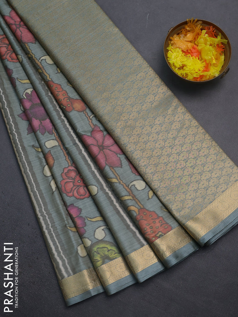 Bangalori semi silk saree grey with floral design ikat weaves and zari woven border