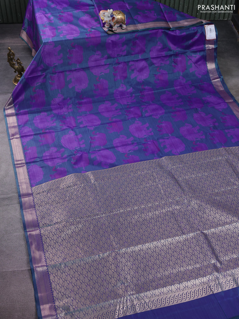 Bangalori semi silk saree purple and teal green with allover elephant butta ikat weaves and zari woven border