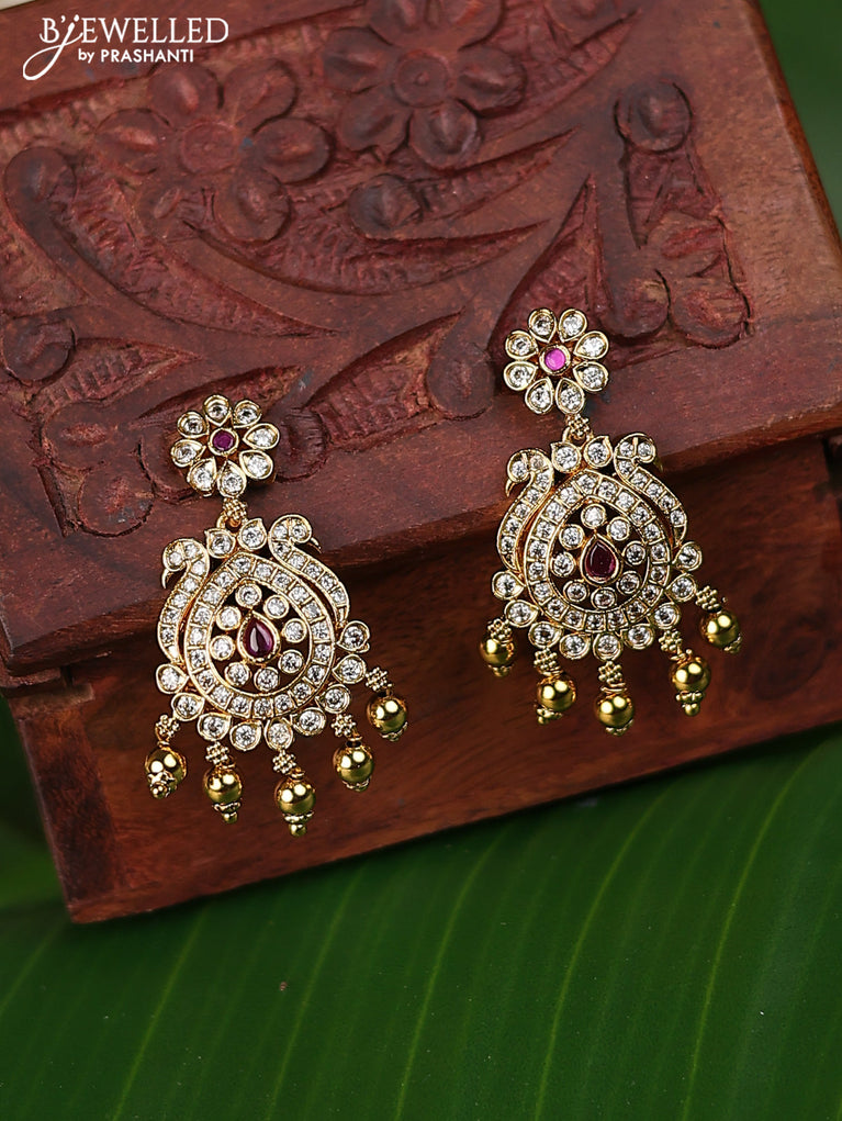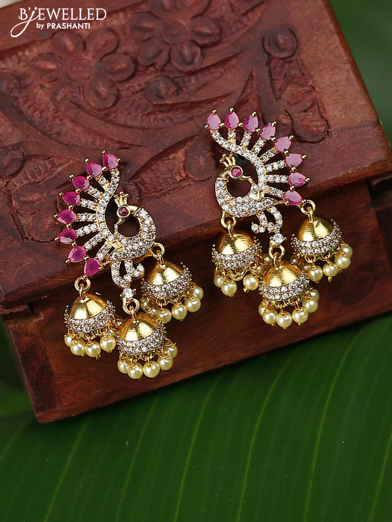 Antique earrings peacock design with pink kemp & cz stones and pearl hangings