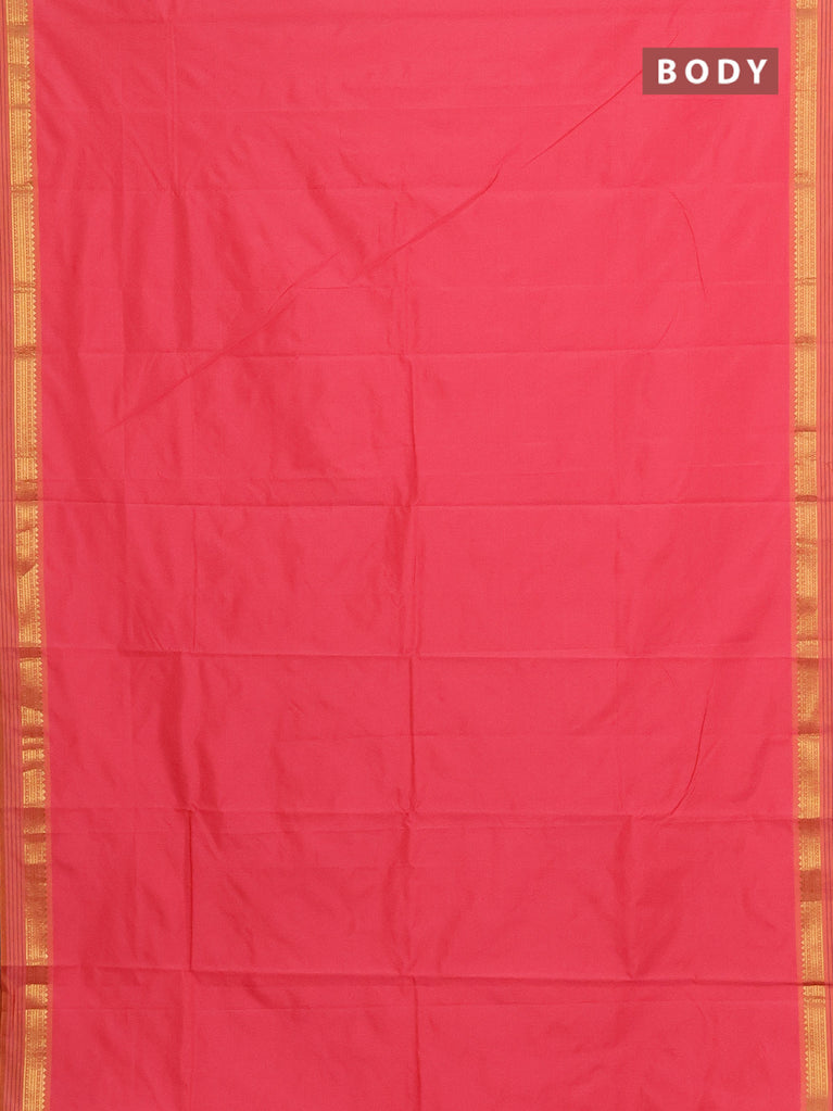 Arani semi silk saree peach pink and dual shade of yellow with plain body and zari woven simple border
