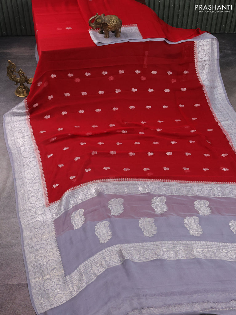 Banarasi chiffon silk saree red and grey with silver zari woven buttas and silver zari woven border