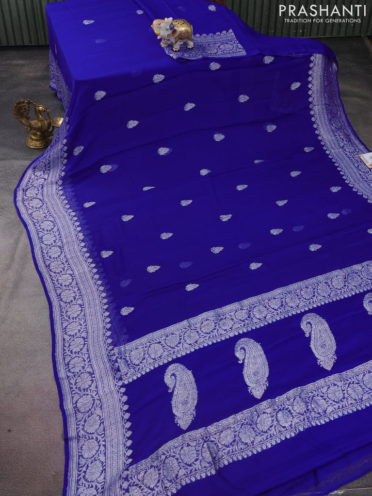 Banarasi chiffon silk saree royal blue with silver zari woven buttas and silver zari woven border