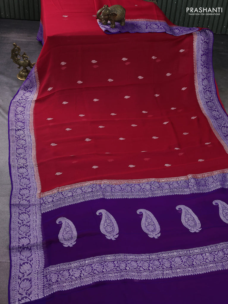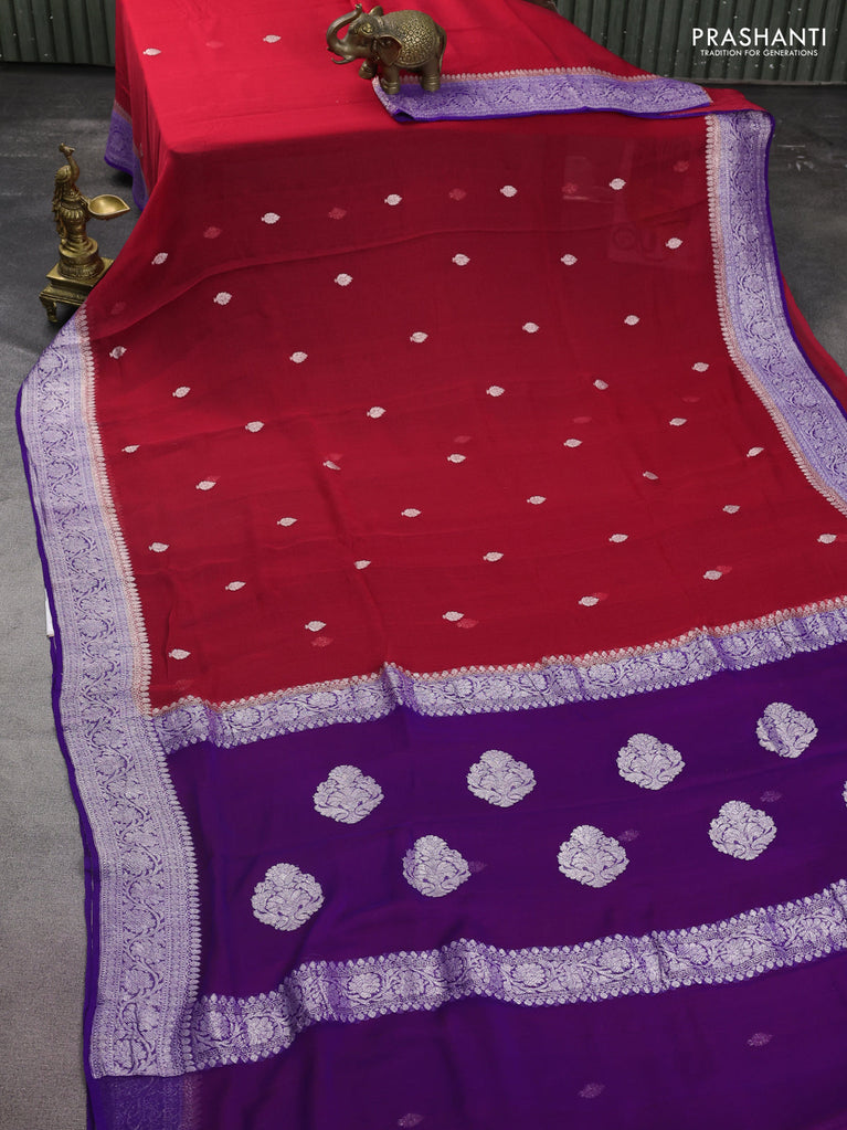 Banarasi chiffon silk saree red and violet with silver zari woven buttas and floral silver zari woven border