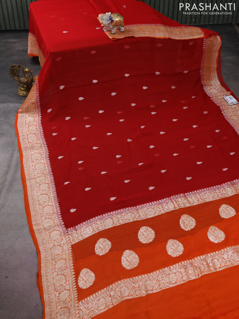 Banarasi chiffon silk saree red and orange with silver zari woven buttas and silver zari woven border