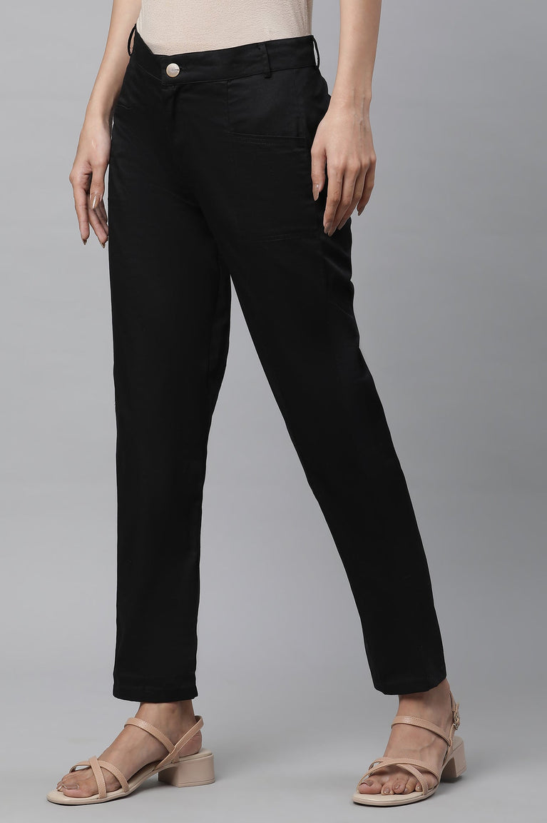Black Solid Straight Fit Cotton Pants With Button Detail