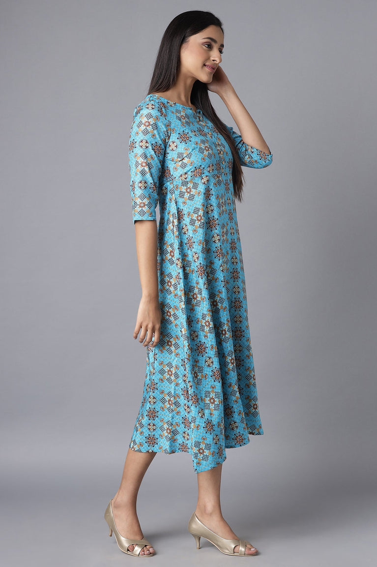 Go forth and dazzle them with this classy yet trendy kurta set. Featuring a blue all-over geometric print kurta that has a zari embroidered round neck and three-quarter sleeves. Well-matched with ankle length solid flared palazzos.