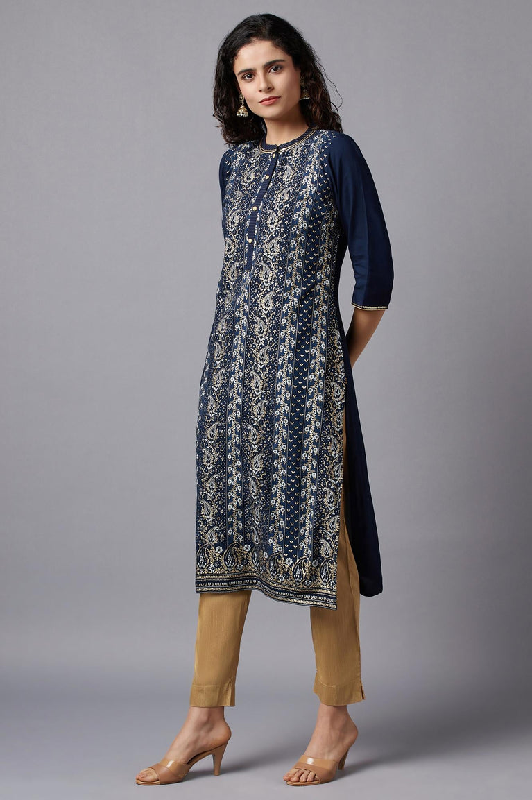 Blue Floral Printed Kurta with Zari Embroidery