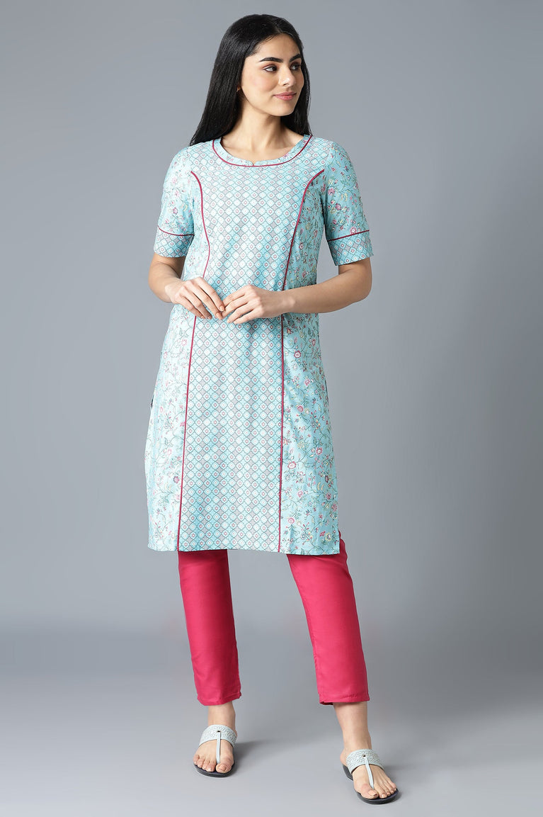 Blue Floral Printed kurta In Round Neck With Pink Solid Trousers