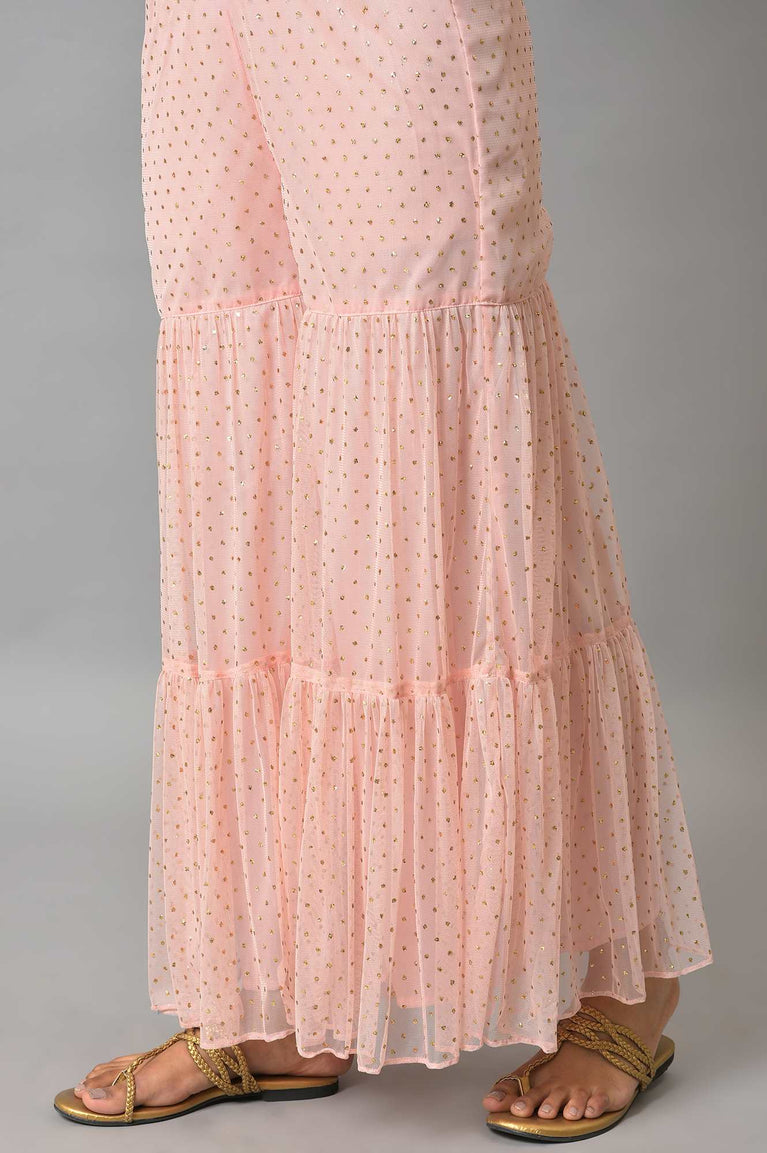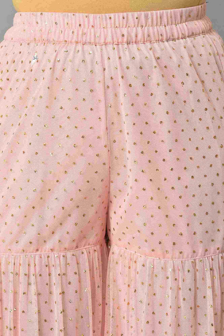 Our Ice Blue Kurta Features An Artistic Print Accentuated With Gold Foil On A Rich Viscose Fabric To Give You A Perfect Festive Look For Any Festivities. This Style Is Coordinated With Pink Glitter Net Sharara Having Attached Lining And A Matching Printed Chiffon Dupatta.