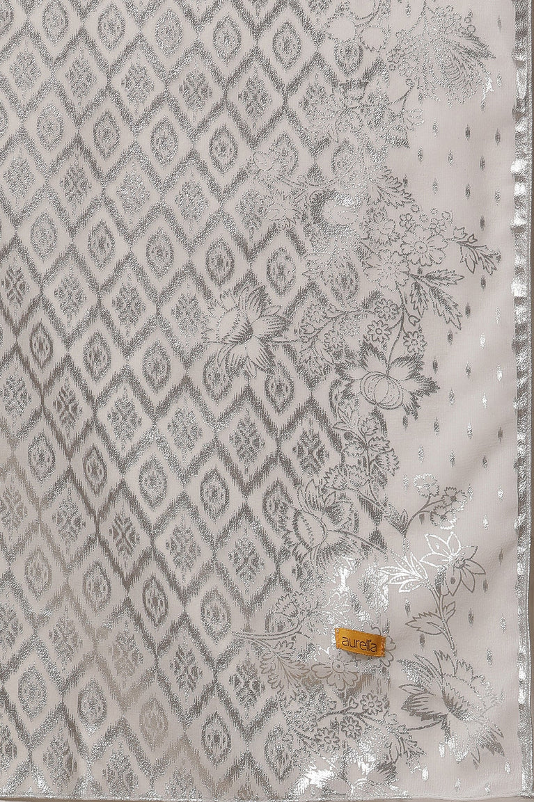 Introducing our beautiful full length flared festive printed kurta set. This set includes a flared kurta which is designed to bring out your inner radiance with a touch of glittery silver accents. This elegant stylized kurta is sure to make you stand out with its seamless heavy embroidered yoke, stealing the show with its intricate and striking design.To enhance its overall beauty, chunky sequin lace embellishment has been added around the yoke and sleeves, creating a perfect blend of traditional and contemporary aesthetics. The contrast piping detail uplifts the look with vibrancy, adding a pop of color to the stunning design. It is paired with contrasting silver tights and printed dupatta.