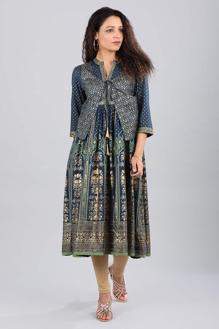 This modern ethnic 2-piece set includes blue coloured Gillet and kurta. This straight Gillet is adorned with floral print and sequin work. And the coordinated sleeveless kurta is solid and has A-line silhouette.