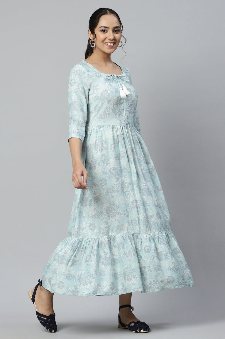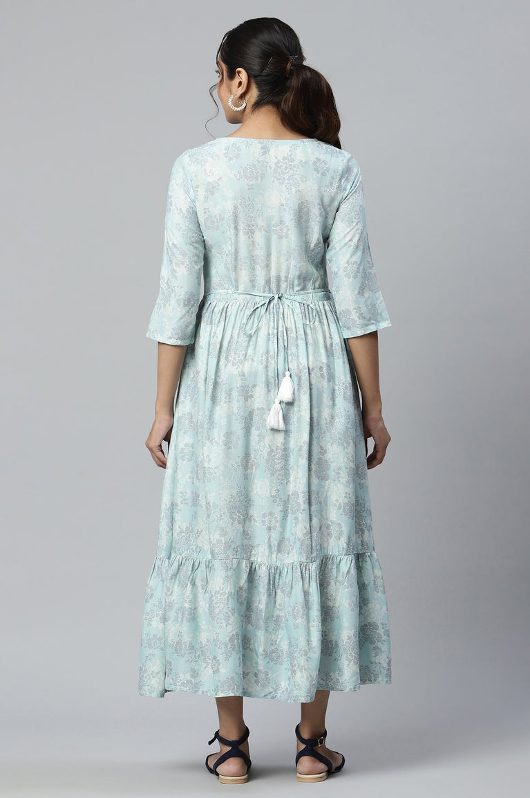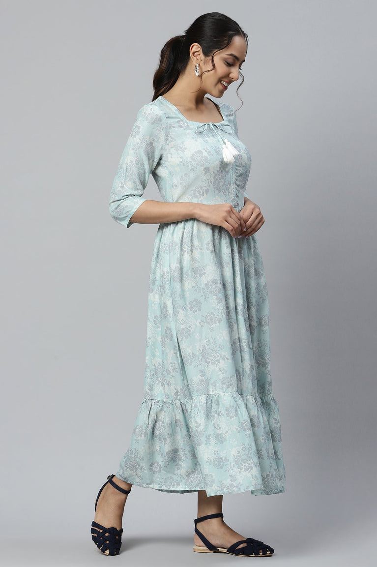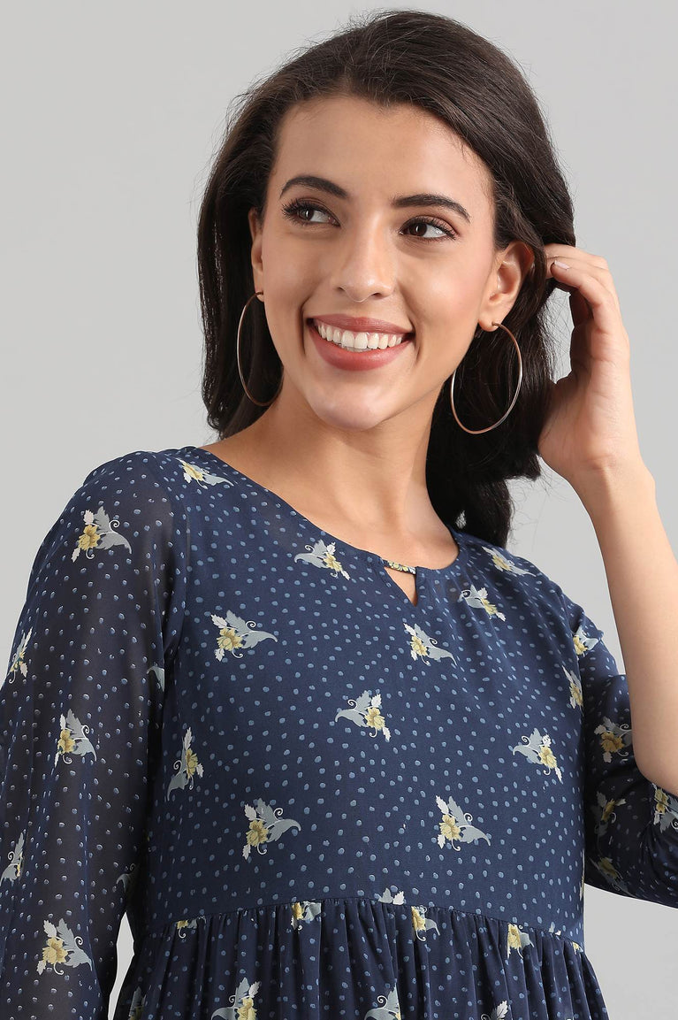 Blue gathered dress in round neck with V and 3/4th sleeves.