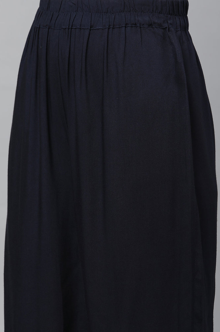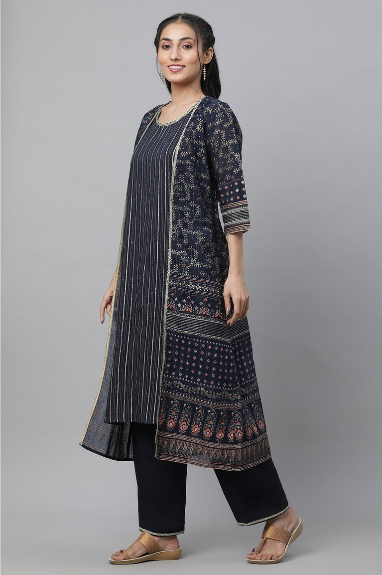 This stylish contemporary set is a must-have for your summer wardrobe. This set includes blue fit and flare Gillet with gathers. The set also includes printed strappy kurta and solid trousers.