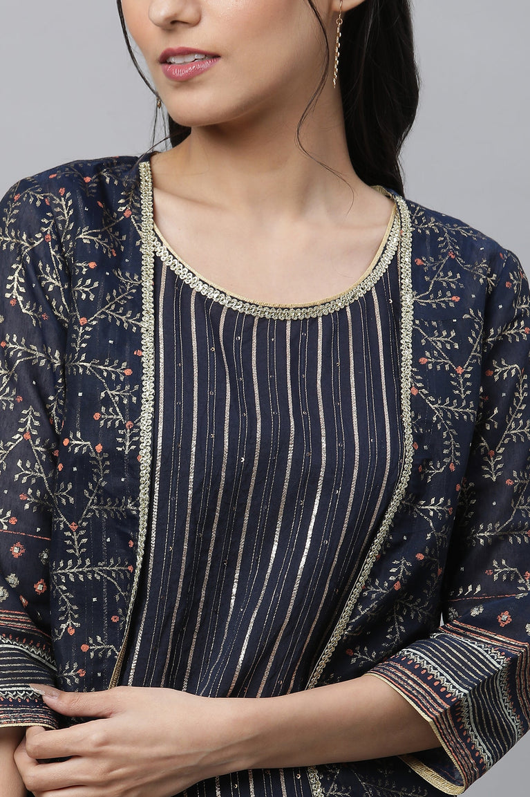 This Modern Ethnic 2-Piece Set Includes Blue Coloured Gilet And Kurta. This Straight Gilet Is Adorned With Floral Print And Sequin Work. And The Coordinated Sleeveless Kurta Is Solid And Has A-Line Silhouette.