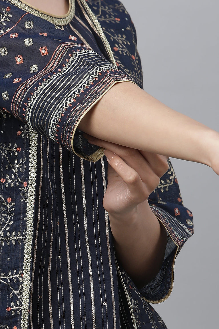 Look gorgeous in this beautiful rich blue colour kurta with gillet set. This outer wear has beautiful jamdani motifs printed on chanderi fabric making the style look very sophisticated. With intricate trims, this style looks very premium and can be worn in any occasion. This top-wear combo also has stylish and very comfy solid narrow palazzo with minimal lace detail on hem.