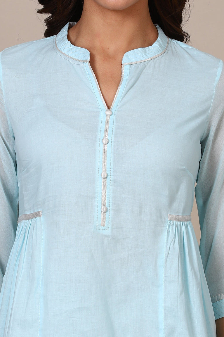 Get a smart office lunch look in this pretty and chic blue gathered kurta set. The set has solid cotton kurta with elegant details. It is paired with grey solid trousers.