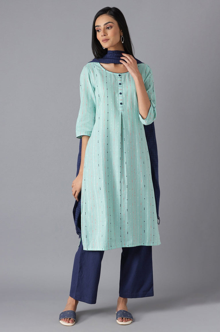 Festivities delve for contemporary attires with delightful hues, striking motifs and intricate detailing. This kurta set features a light blue glittered mughal print layered A-line kurta having zari embroidered yoke with round neckline and three-quarter sleeves. Well-matched with slim fit solid trousers.