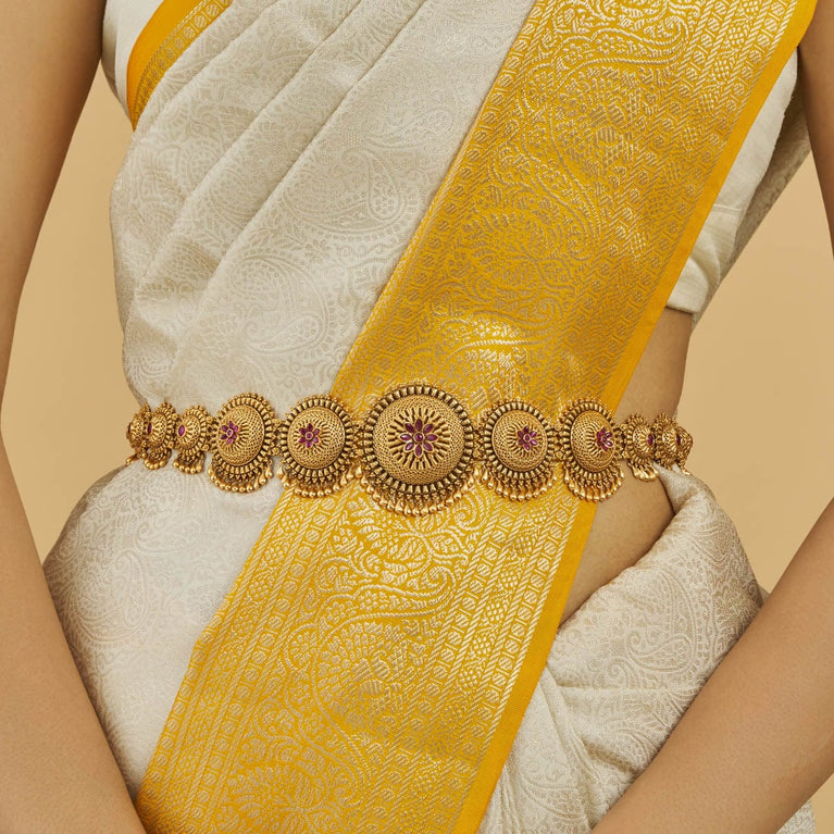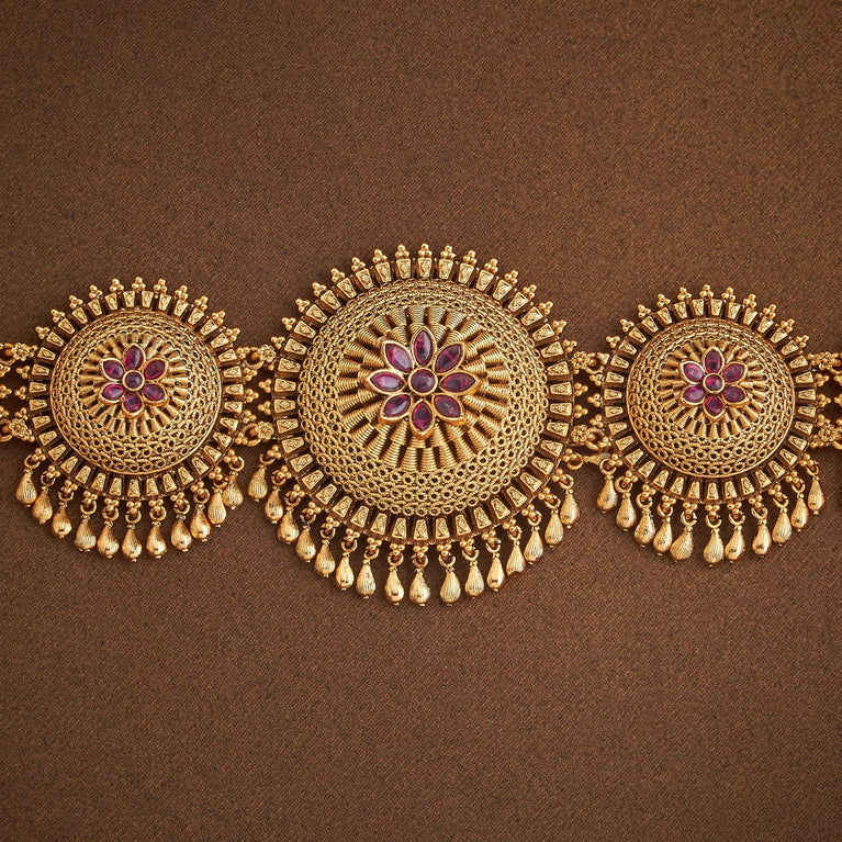 Kushal's Fashion Jewellery Flower Design BeltIf you are tired of wearing the common fashion accessories and want something different to touch up your look, you need our latest antique belt studded with ruby stones. This belt will go perfectly with all ethnic outfits and traditional accessories to effortlessly make you the trendsetter this wedding season.