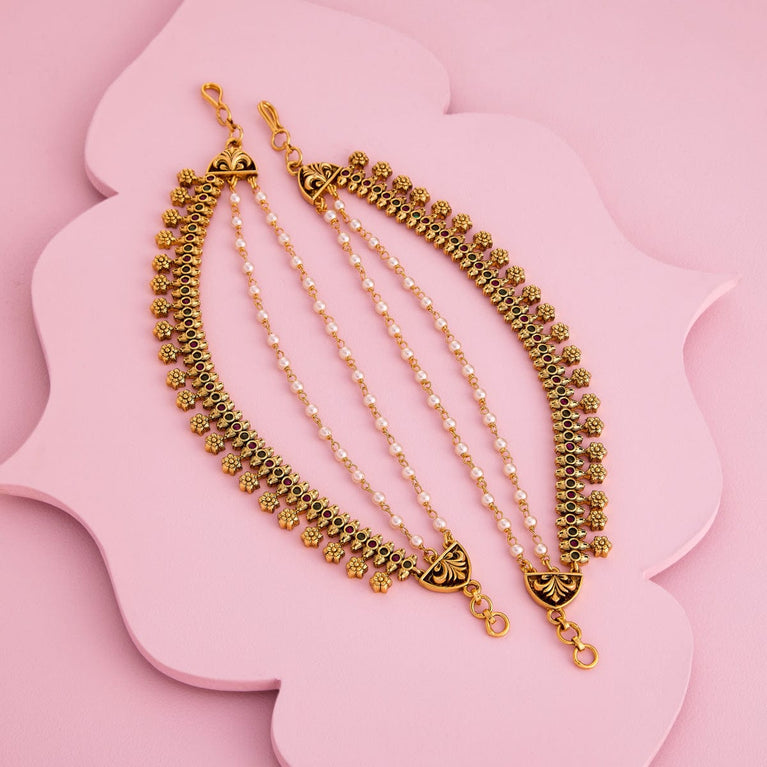 Flower Motif Antique NathGet ready to make a statement with this antique nath from Kushal's Antique Jewellery Collection. Crafted from a lightweight copper alloy base, it adds a touch of vintage charm to your look. It is available in three colour options: ruby, ruby-green and white. For a complete look, pair it with a dhoti-kurti set.