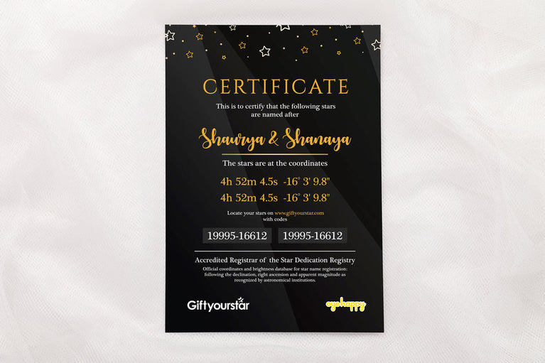 Specifications: Oye Happy is a verified facilitator between the naming service and the customer. The company, GiftYourStar, is an Accredited Registrar of the Star Dedication Archives. Size of the frame (without glass): A4The star can only be booked for the current year, not for previous years. If you input the date of the occasion as 17/03/1987, the star will automatically be booked for the current year, regardless of the entered date.