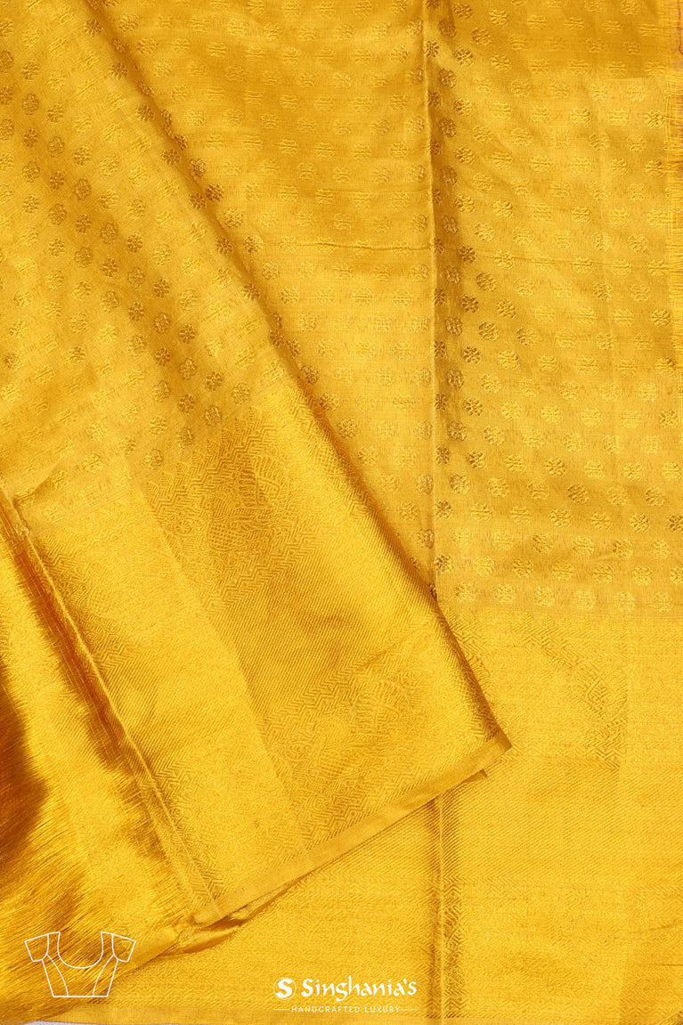 A luminous bright gold kanjivaram silk saree where the body features delicate floral jaal weaving in fine gold zari, complemented by a rich pallu displaying classical peacock and kaddi patterns. The broad border adds a fresh dimension to this timeless piece.