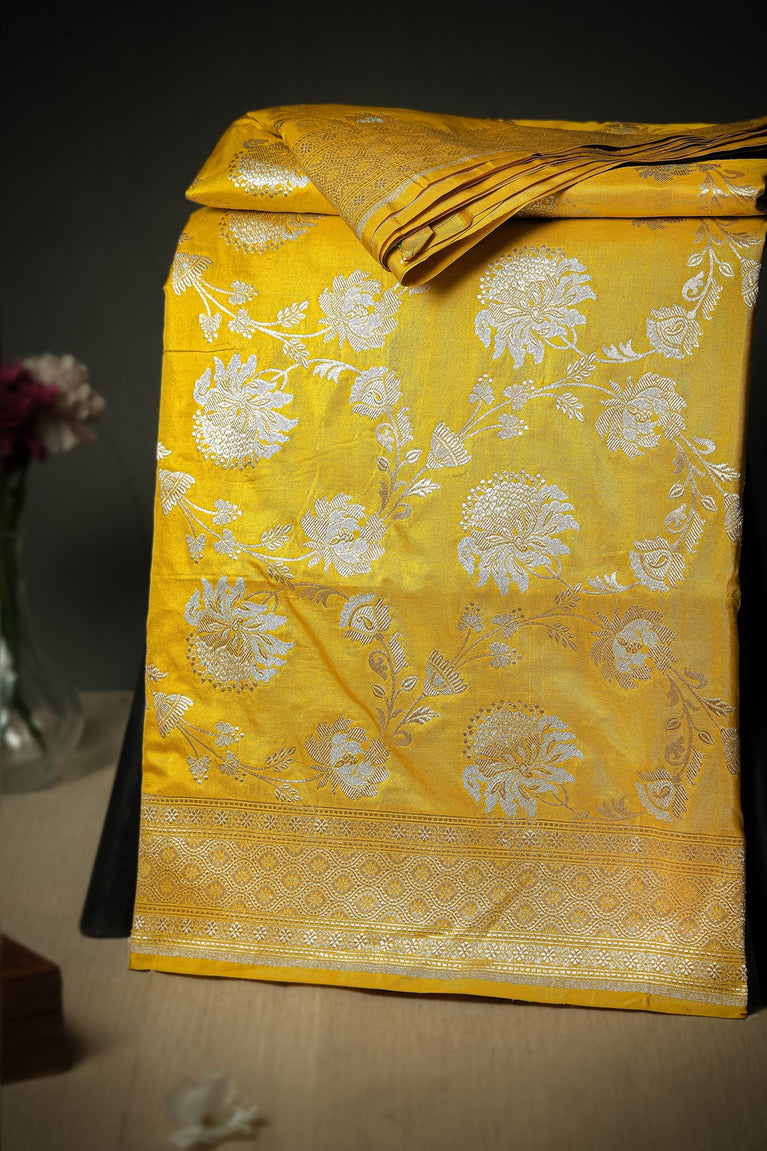 Mandir Yellow & Silver Banarasi Jaal Saree