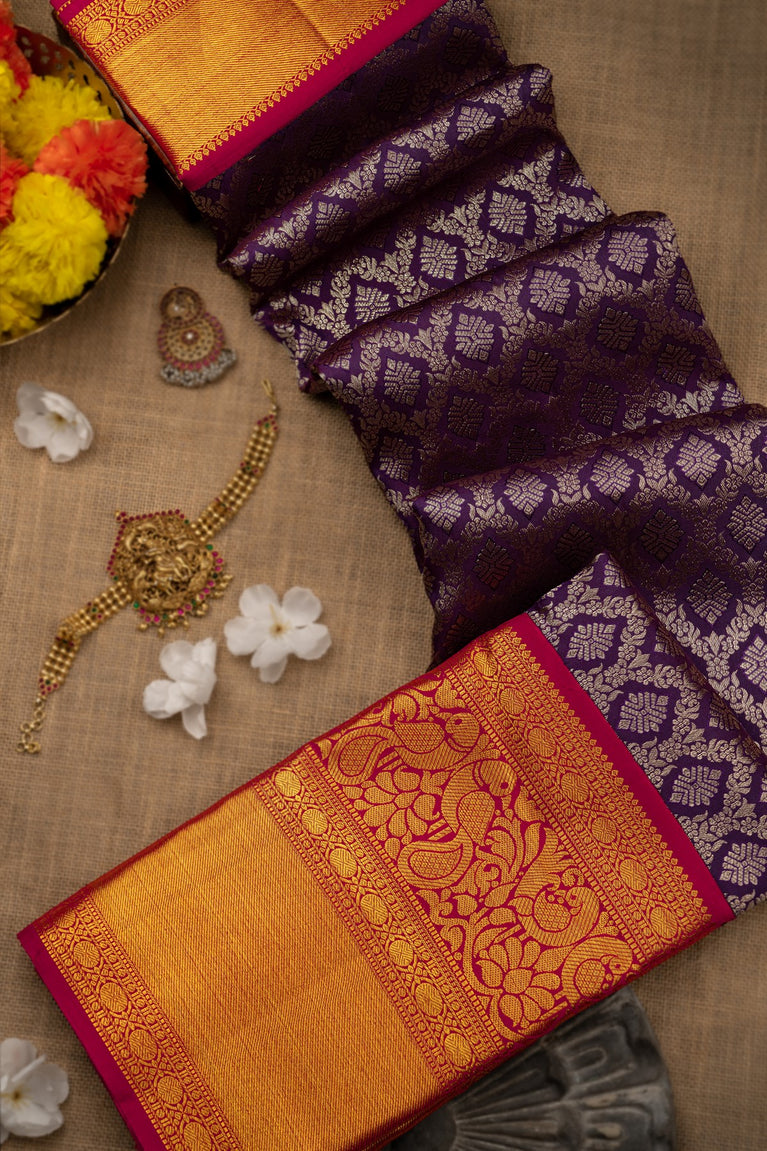 Mandir Navy Blue & Maroon Kanchipuram Floral Jaal Saree