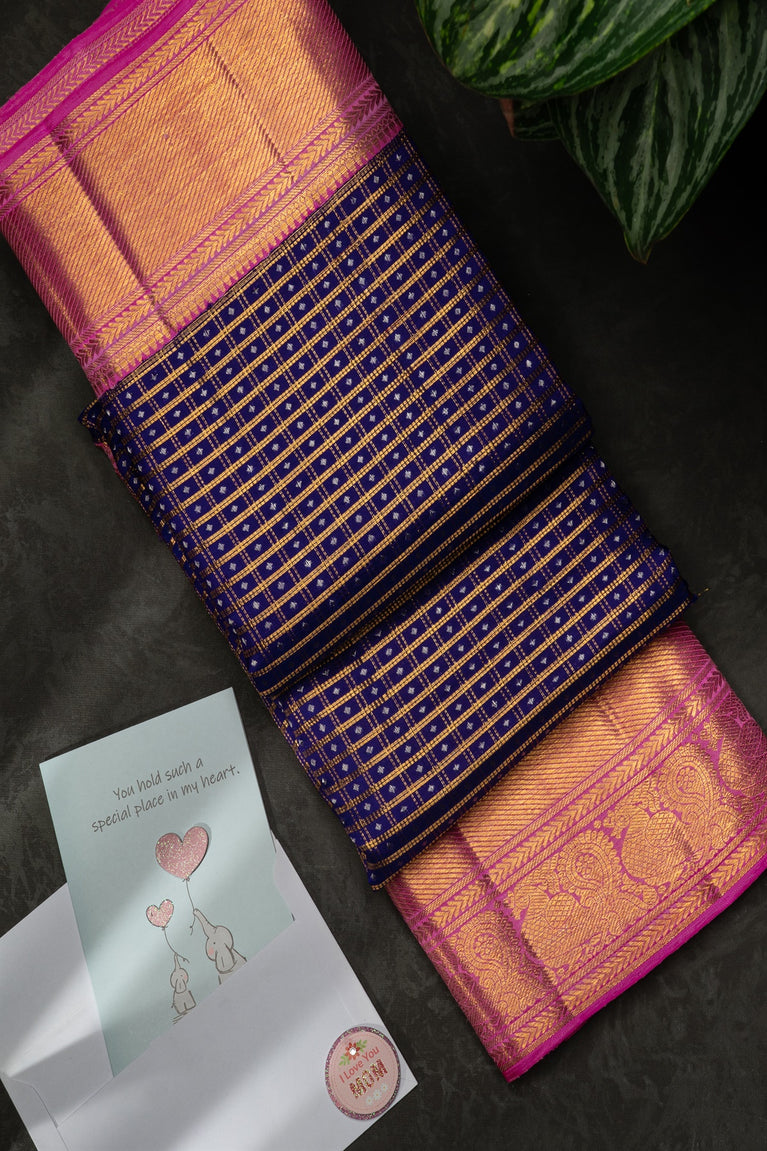 Mandir Navy Blue & Pink Kanchipuram Checks And Buttis Saree