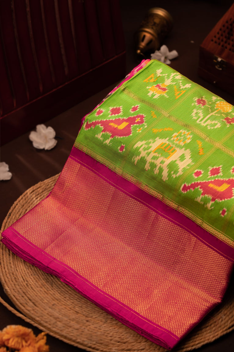 Mandir Parrot Green & Pink Ikat Ikat Saree