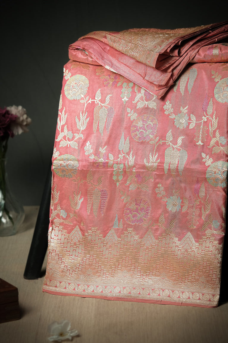 Mandir Onion Pink & Gold Banarasi Floral Jaal Saree