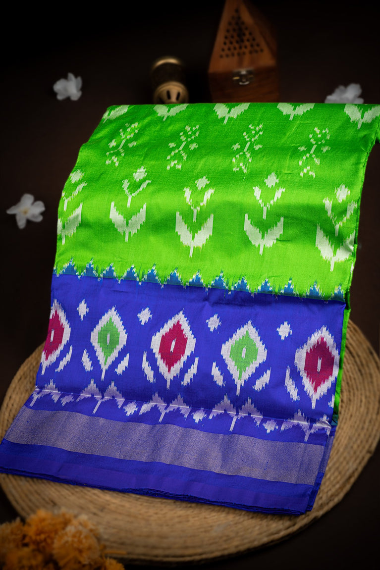 Mandir Parrot Green & Royal Blue Ikat Ikat Saree