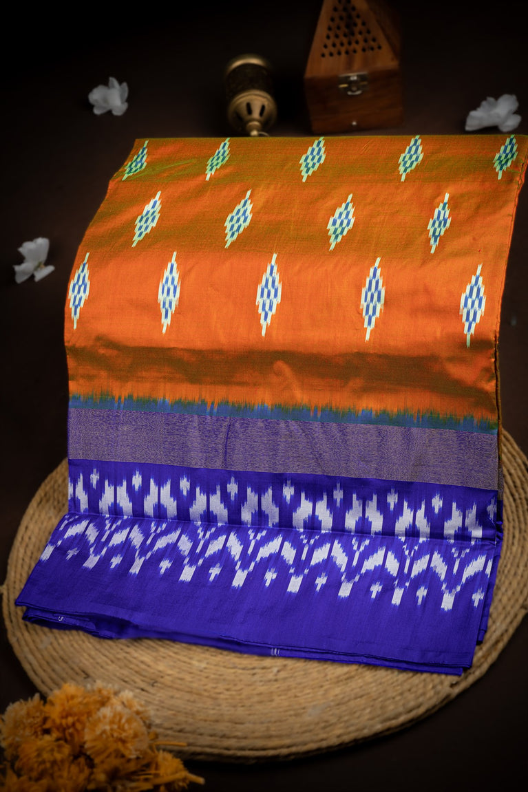 Mandir Orange & Royal Blue Kanchi Ikat Ikat Saree