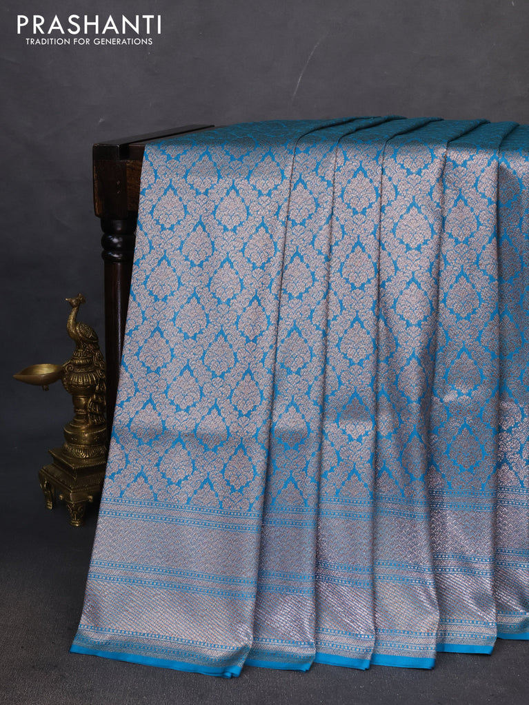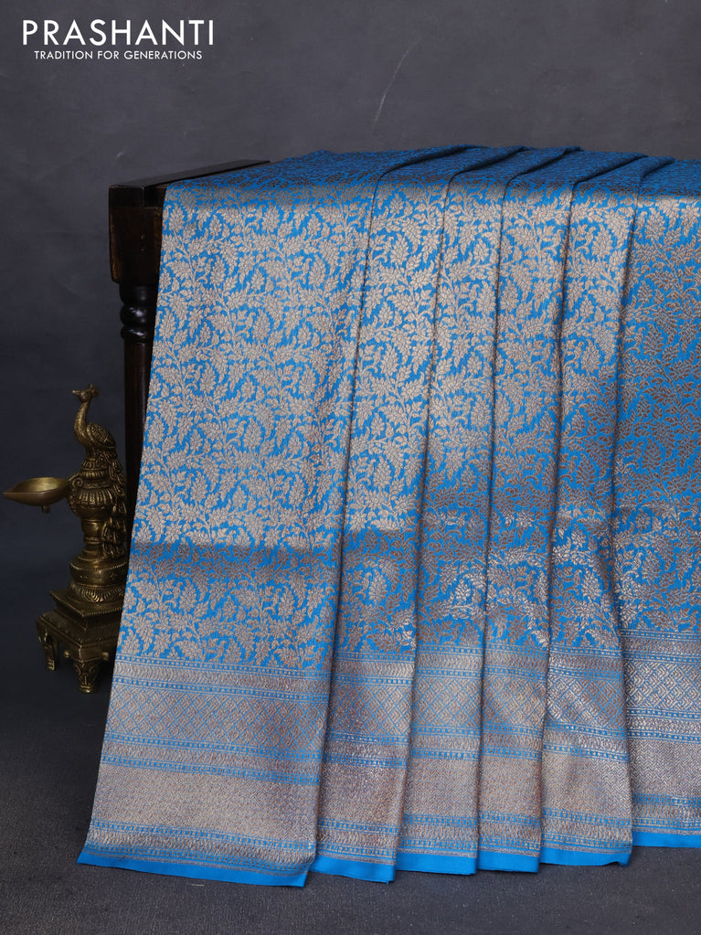 Banarasi semi katan saree cs blue with allover thread & zari woven brocade pattern and woven border