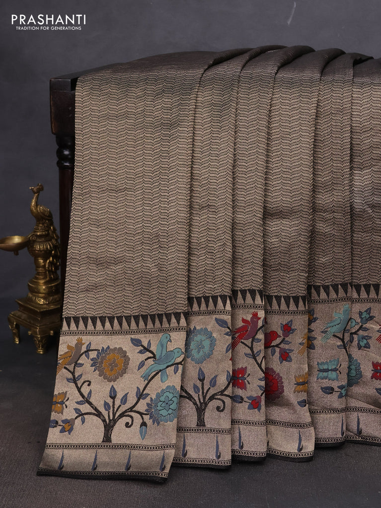 Banarasi semi raw silk saree coffee brown with allover silver zari woven paithani weaves and silver zari woven border