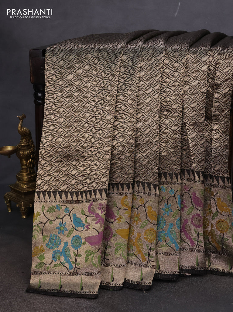 Banarasi semi raw silk saree black with allover zari woven brocade weaves and floral design paithani border