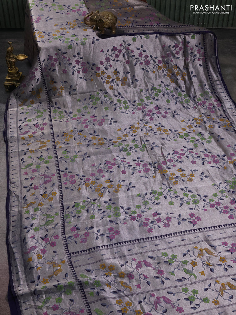 Banarasi semi raw silk saree navy blue with allover silver zari woven paithani weaves and woven border