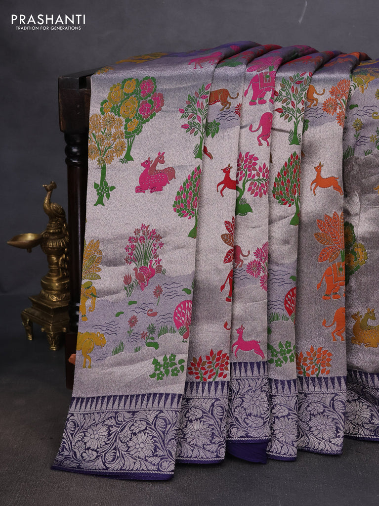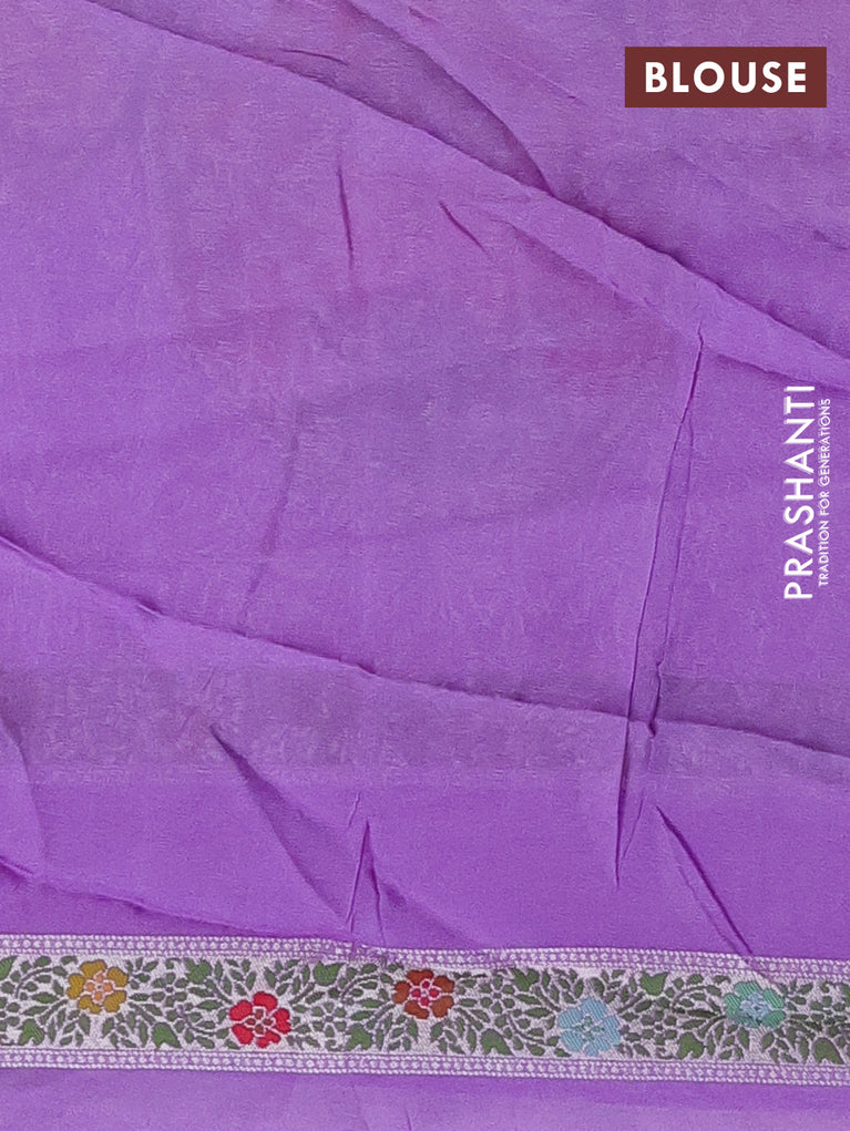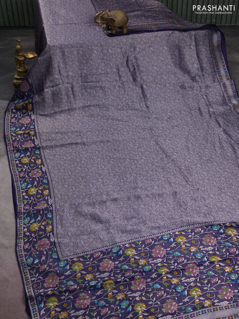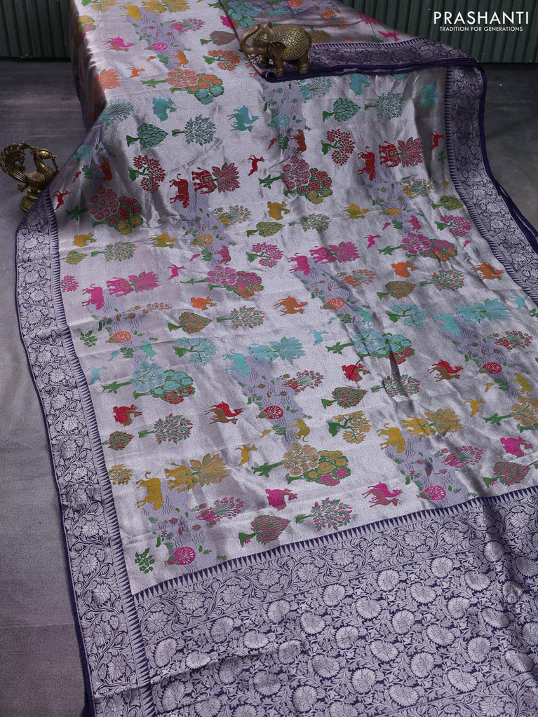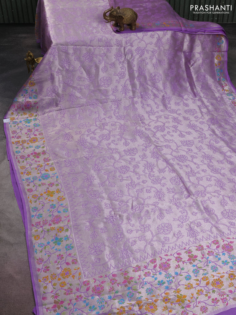 Banarasi semi raw silk saree lavender with allover silver zari woven floral weaves and floral design paithani border