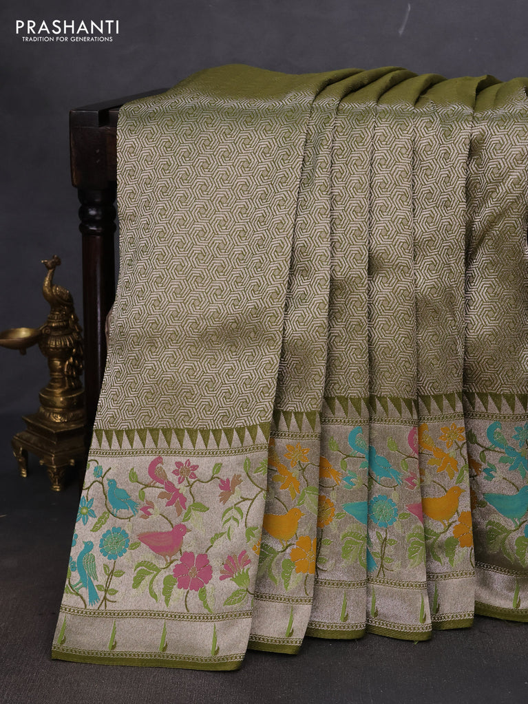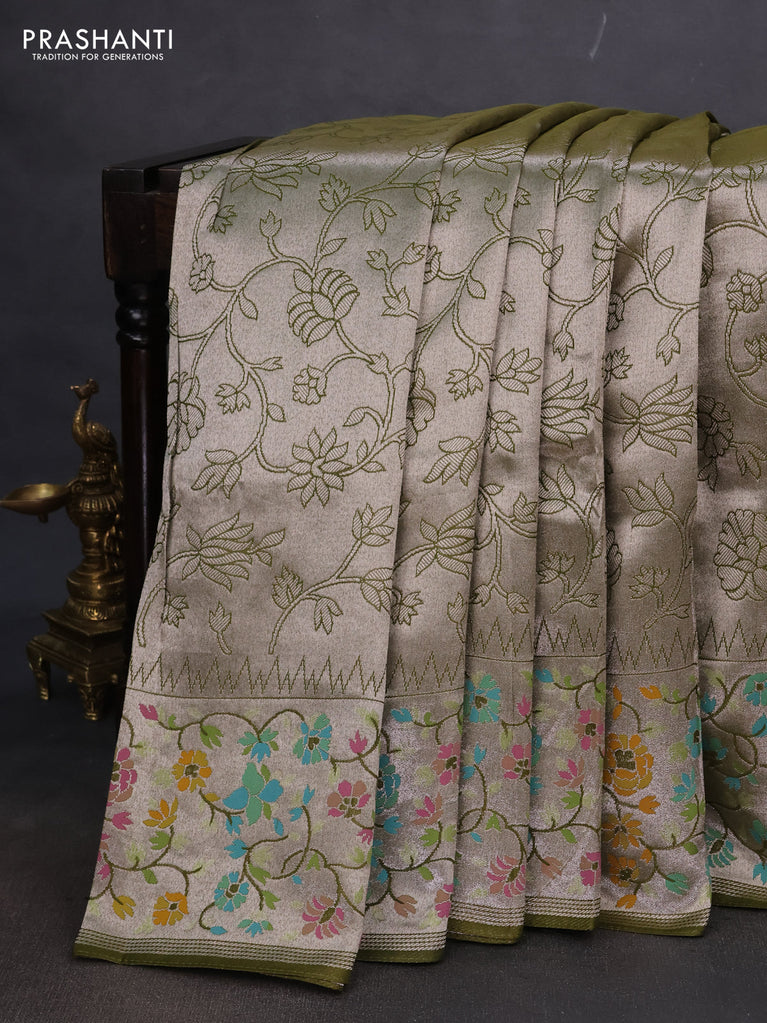 Banarasi semi raw silk saree mehendi green with allover silver zari woven floral weaves and floral design paithani border