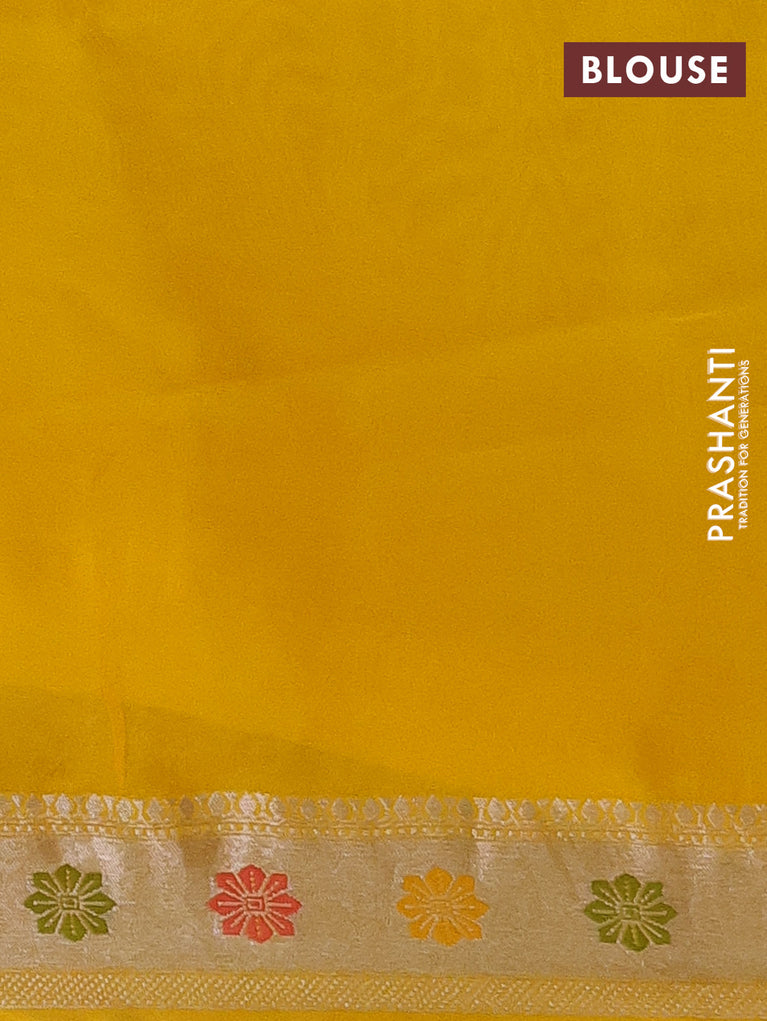 Banarasi semi raw silk saree yellow with allover silver woven brocade weaves and floral design paithani border