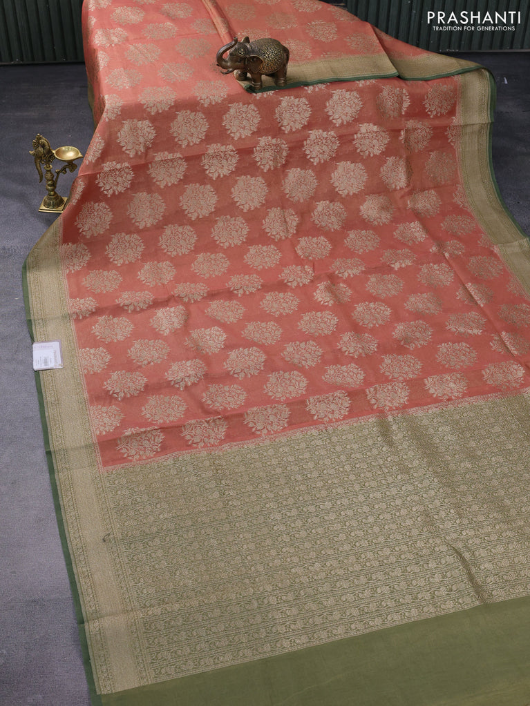 Banarasi tissue silk cotton saree pastel peach shade and elaichi green with allover thread & zari woven butta weaves and woven border