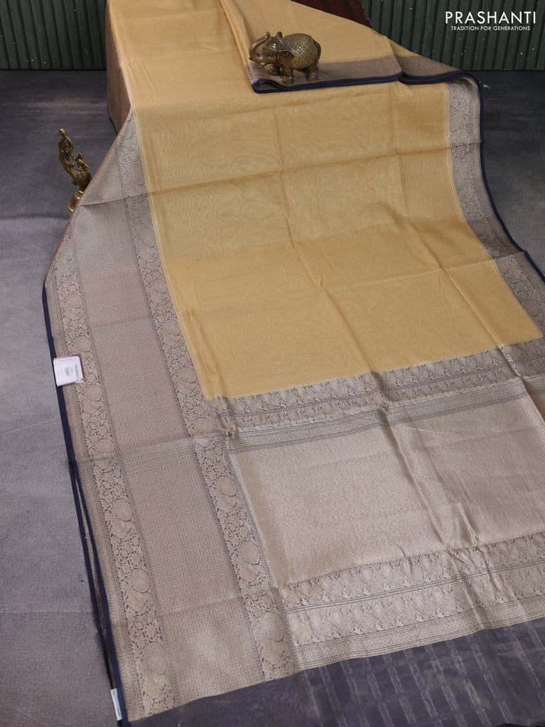 Banarasi tissue silk cotton saree sandal and navy blue with plain body and long woven border