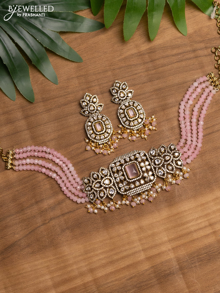 Beaded baby pink choker with baby pink & kundan stones and beads hanging in victorian finish